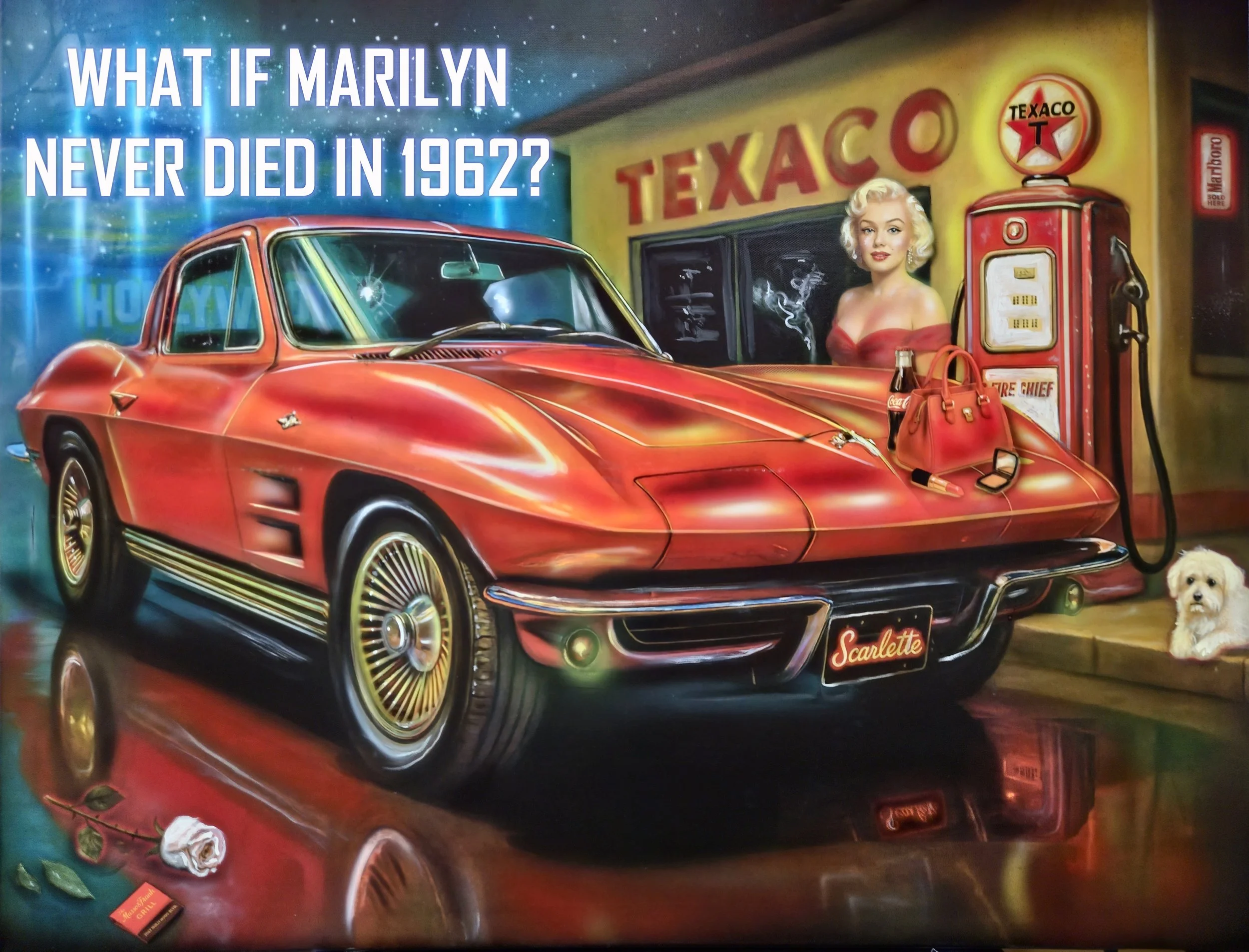 At her feet sits Maf, short for Mafia, the small white dog gifted to her by Frank Sinatra. His name itself is a nod to the darker, more complicated world of Hollywood power players and secrets. In the painting, Maf sits on the curb, not on the car, looking almost sorrowful — perhaps knowing a truth Marilyn herself can’t face.